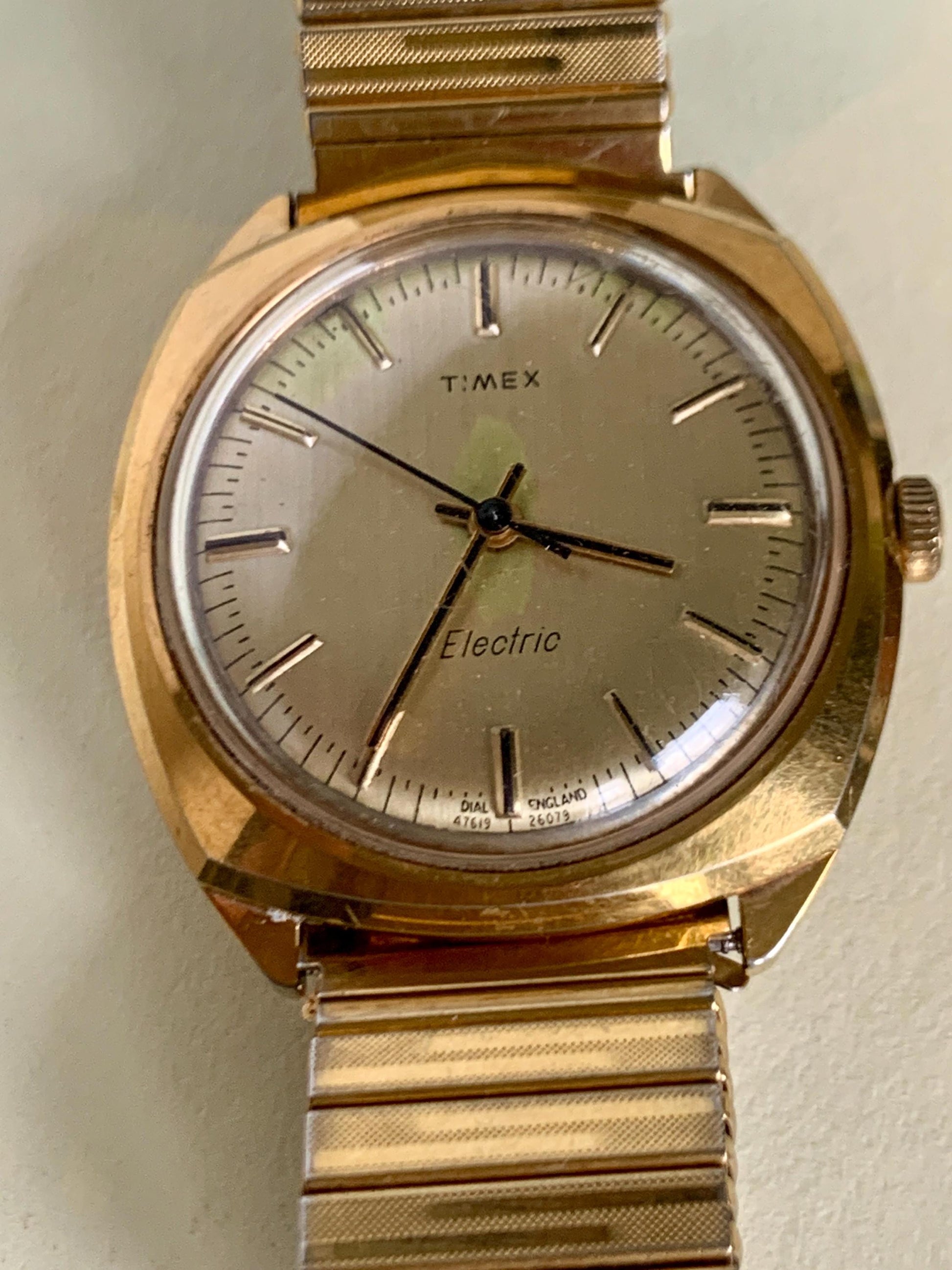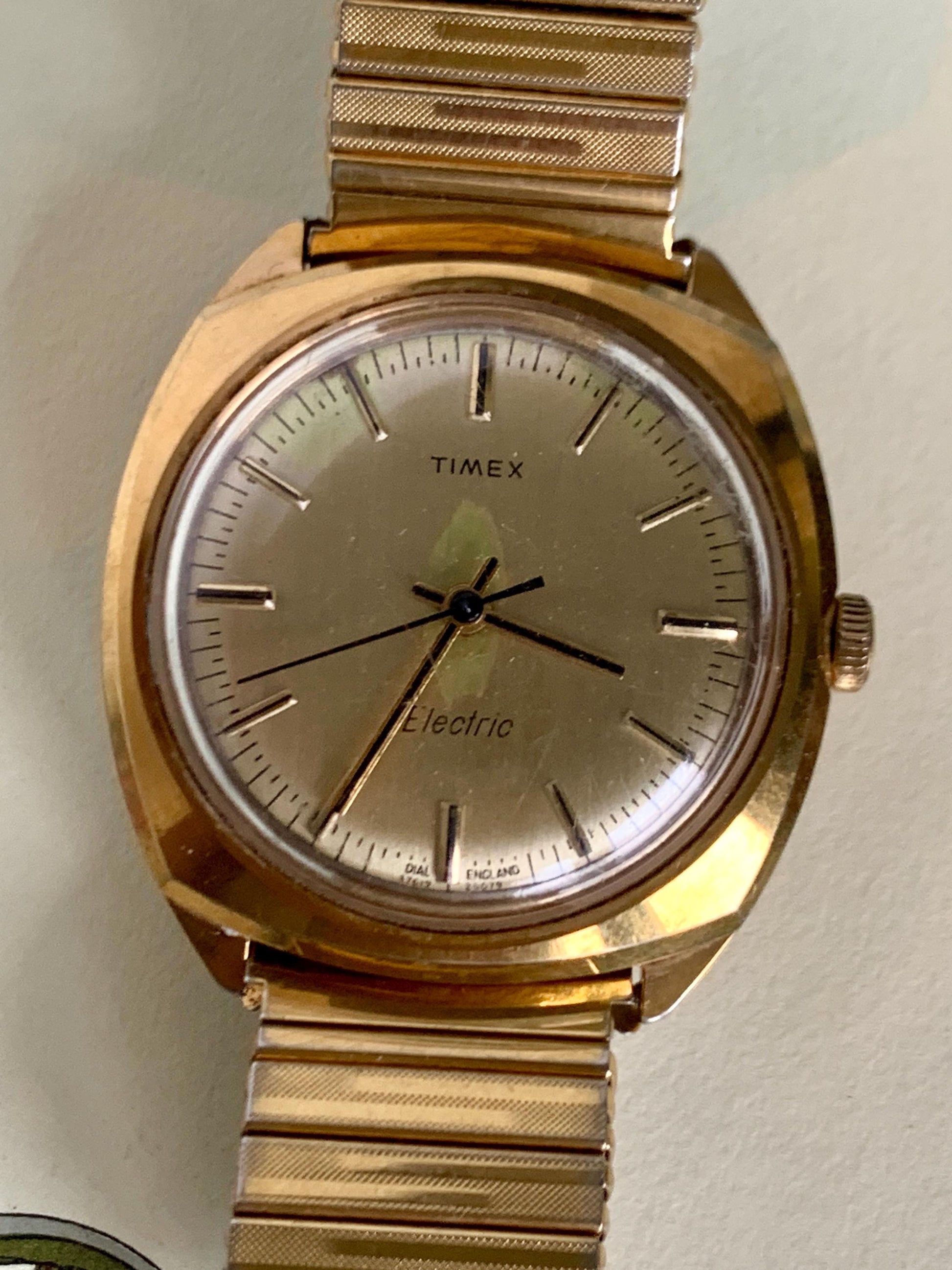 Here's a nice 1970s Timex Electri! These 70s style Timex electric watches had a truly one-of-a-kind look. The gold-tone case and period expanding band complete the retro aesthetic. This watch is in decent worn condition and runs, making it a fantastic addition to any vintage watch collection. Gold tone of case exactly matches gold tone of expanding watch band (this isn't common!)