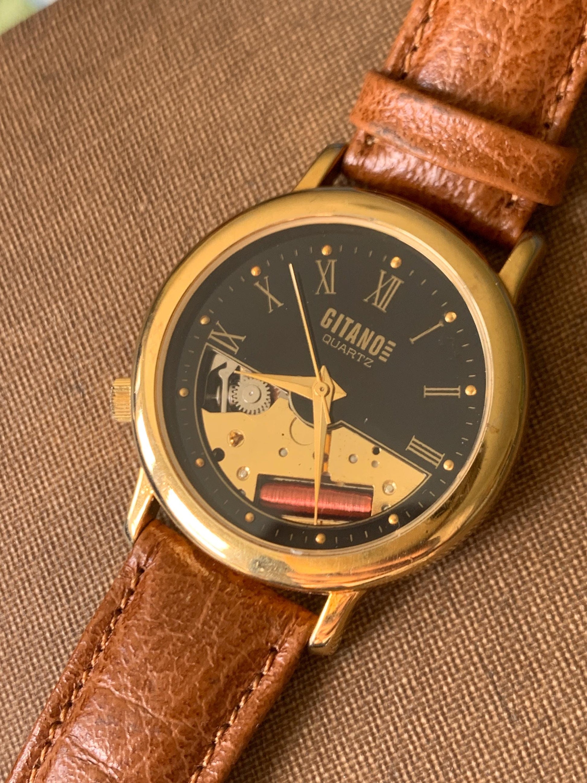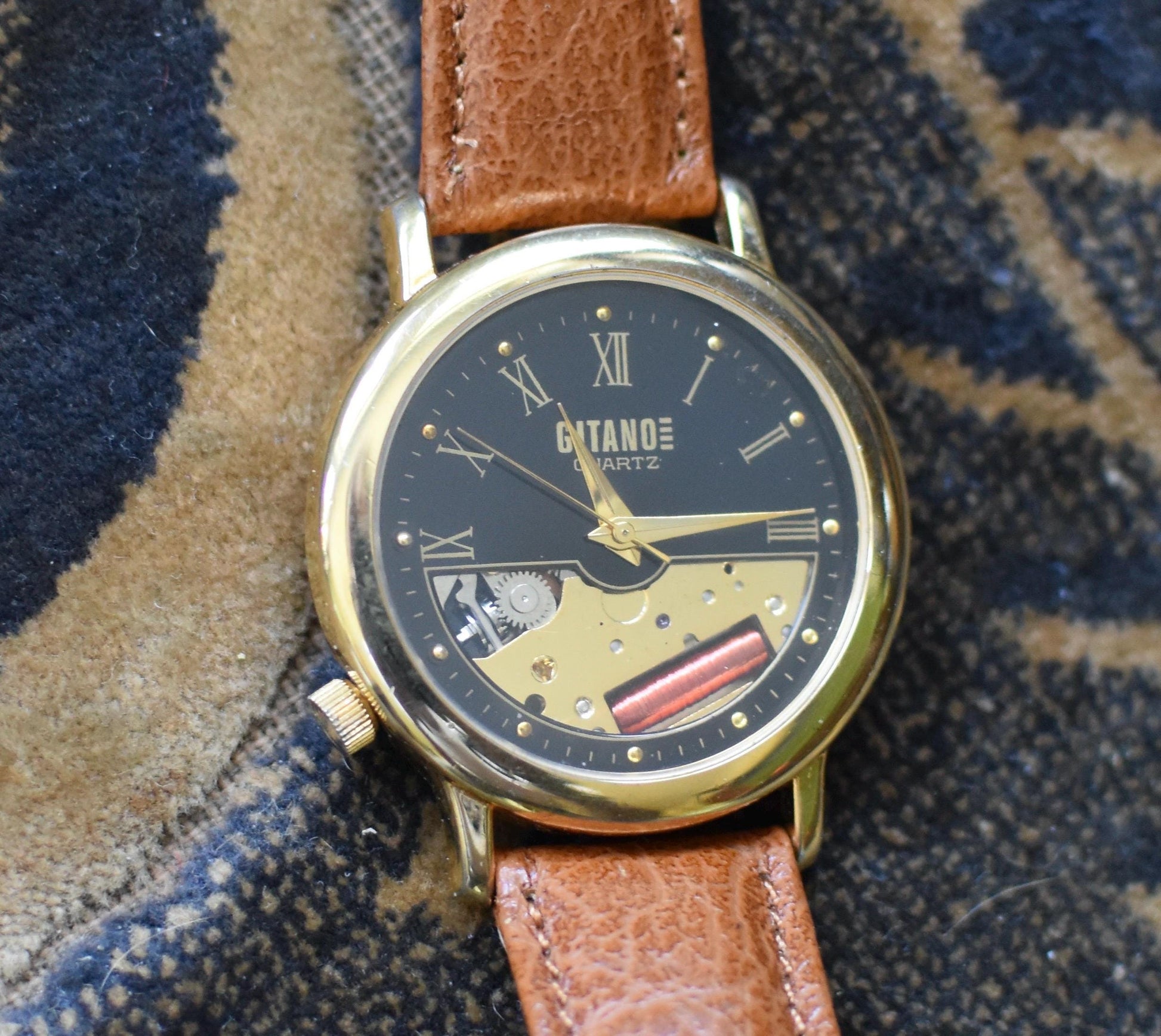 Who doesn't love the 1990s? Get a glimpse with this Gitano Roman Skeleton Quartz watch. Featuring a top half striking black dial with classic Roman numerals, and below is real showstopper -- the exposed quartz movement, offering a peek into its inner workings. It comes with its original unworn band , has a fresh new battery installed, and is ready to turn heads with its unique and slightly edgy aesthetic.