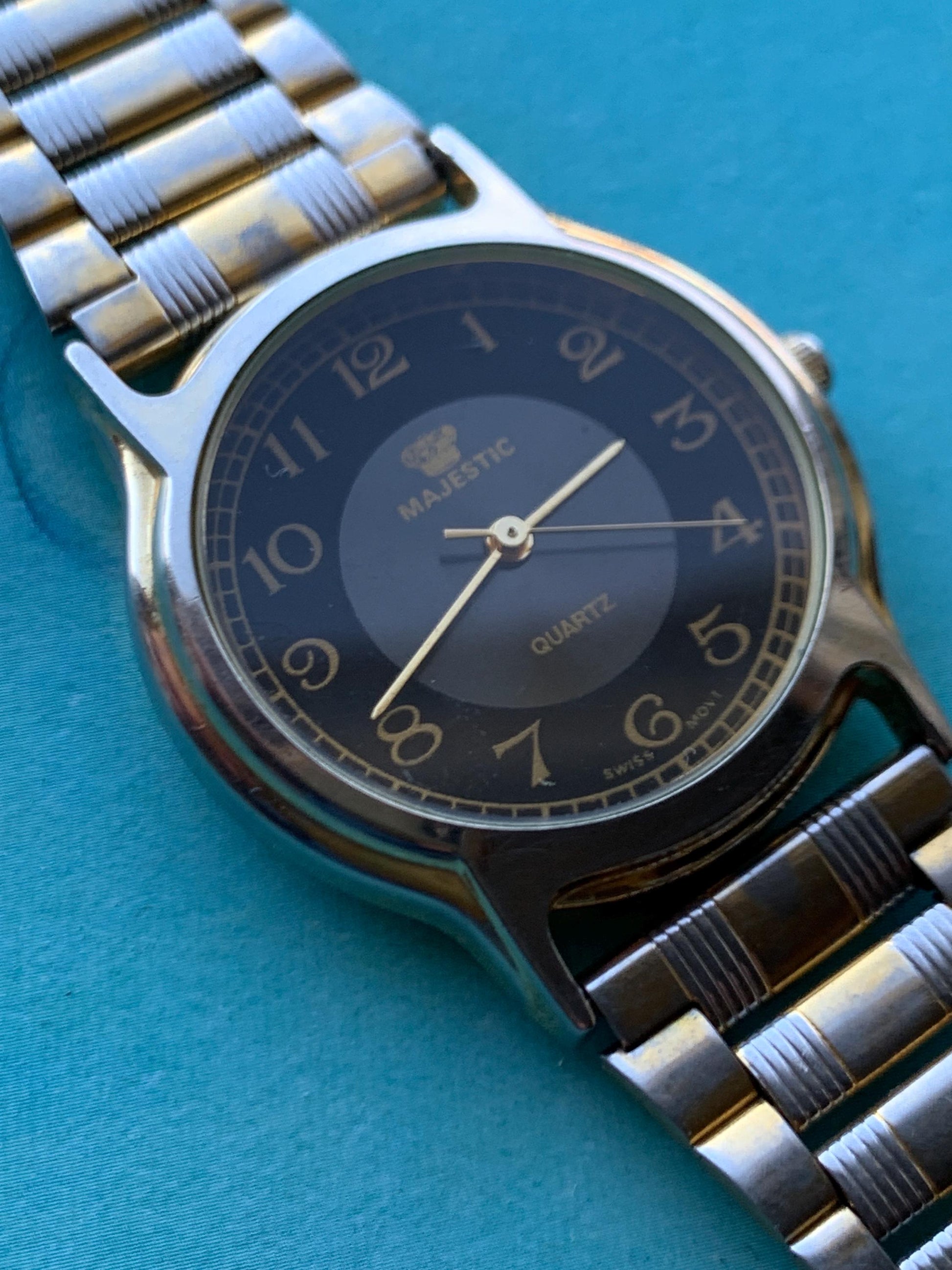 Classic Appearance Black Dial Majestic Watch. 32mm Good used condition. Quartz, New Battery, Two-Tone case and Bracelet. Dial Two-Tone Black