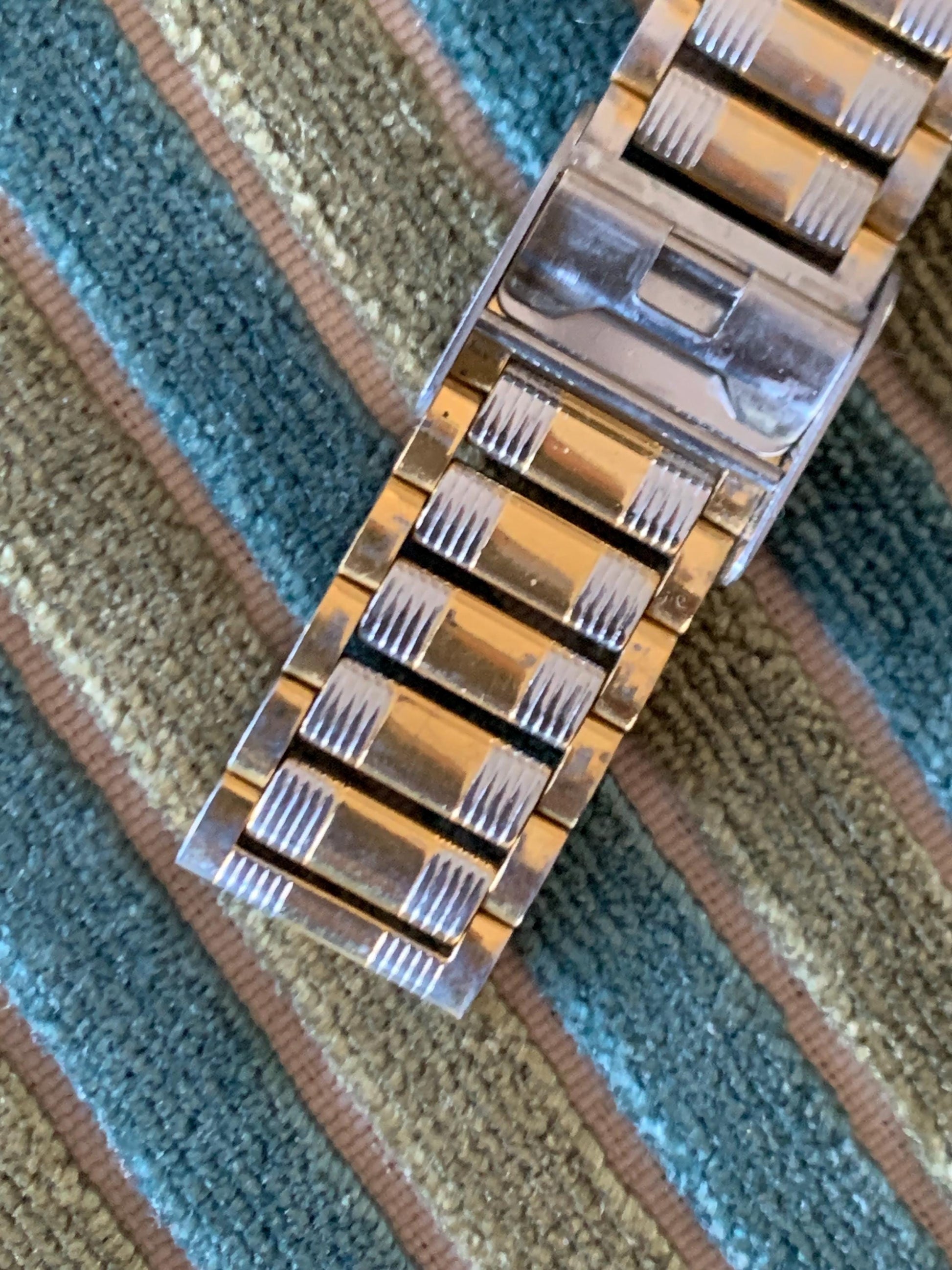 A few light scratches here and there, but nothing significant. One tiny, tiny pin-point nicks on the crystal. Case back has a little wear. Some wear to the plating on bracelet.
