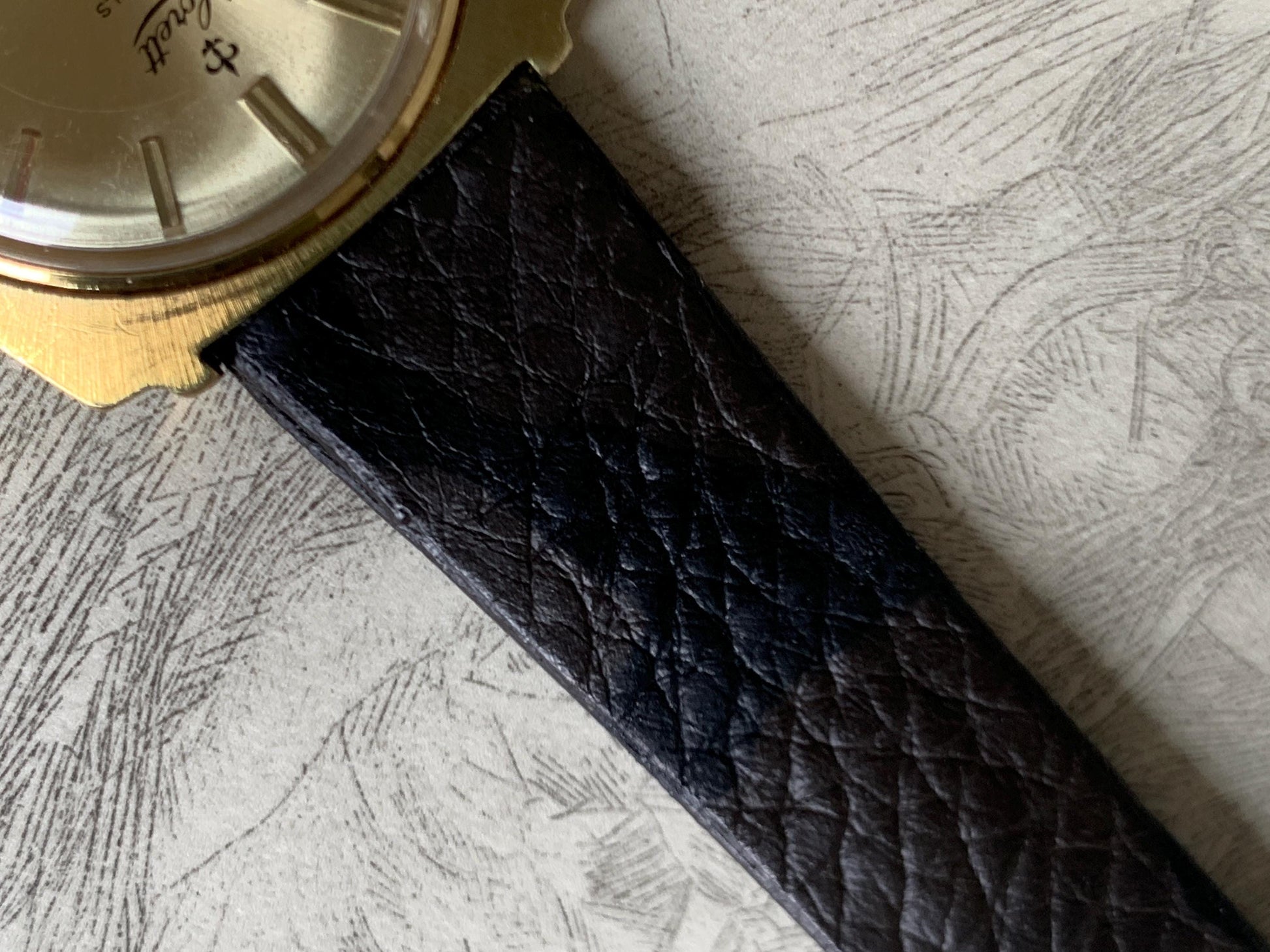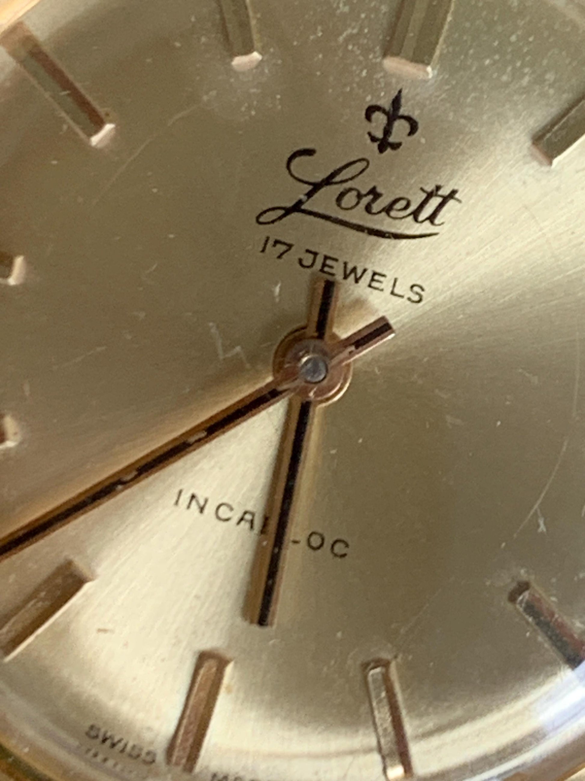 Super cool early 70s Swiss-made Lorett winder! Features a radiant golden dial in a slim, square gold-tone case, complete with Incabloc protection (helped make winder watches more shock-proof). Works great, with gently worn (but reconditioned) vintage-style leather strap. A fantastic piece of retro wristwear. Note: Strap has a small area of color variance that is likely from an old ink stain or some such).