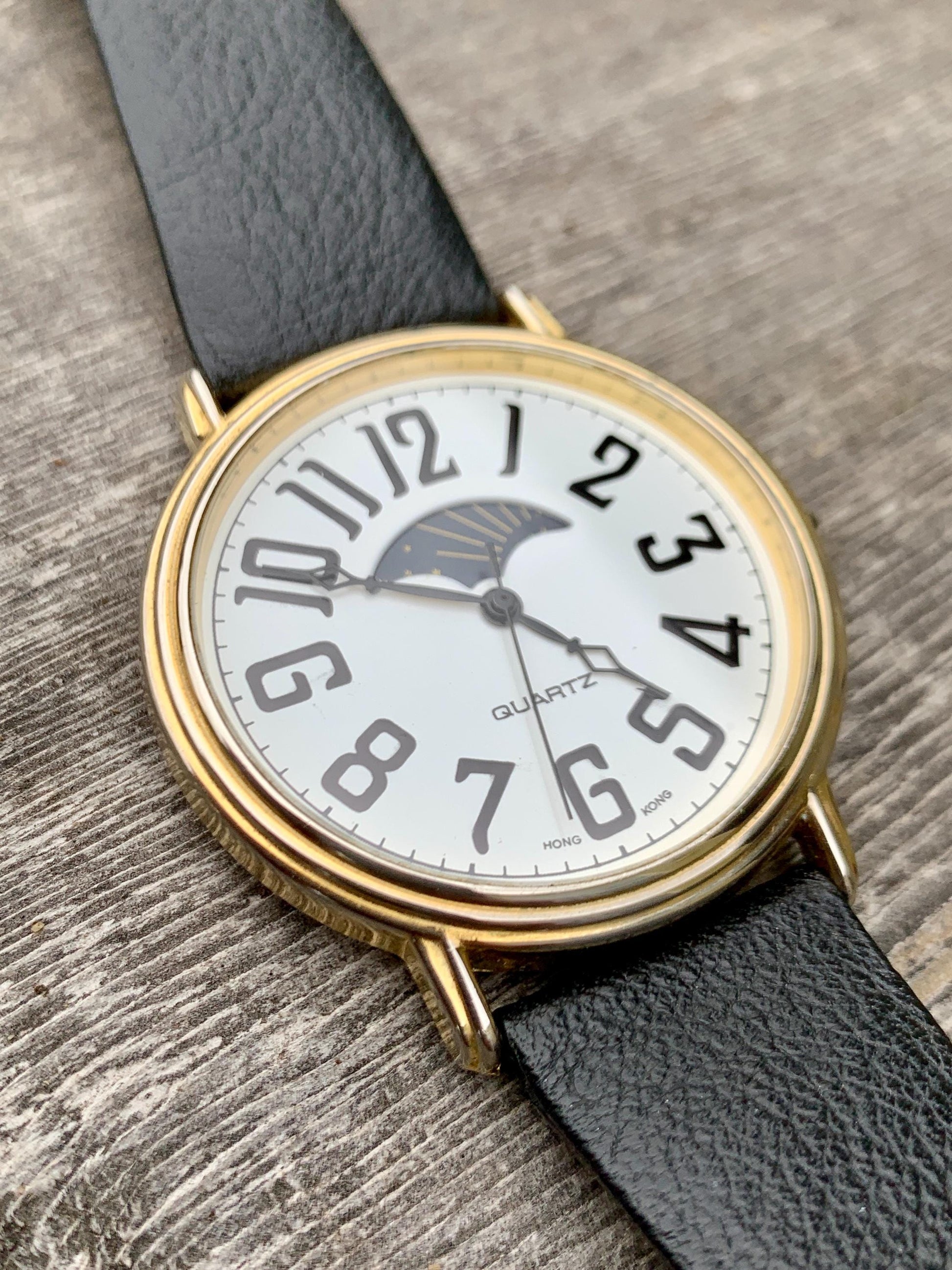 Excellent Large 90s Sun Moon Watch - 44mm Three-Hand 'Moonphase' with Original Leather Band Sun Moon Day Night Watch. Excellent Condition.