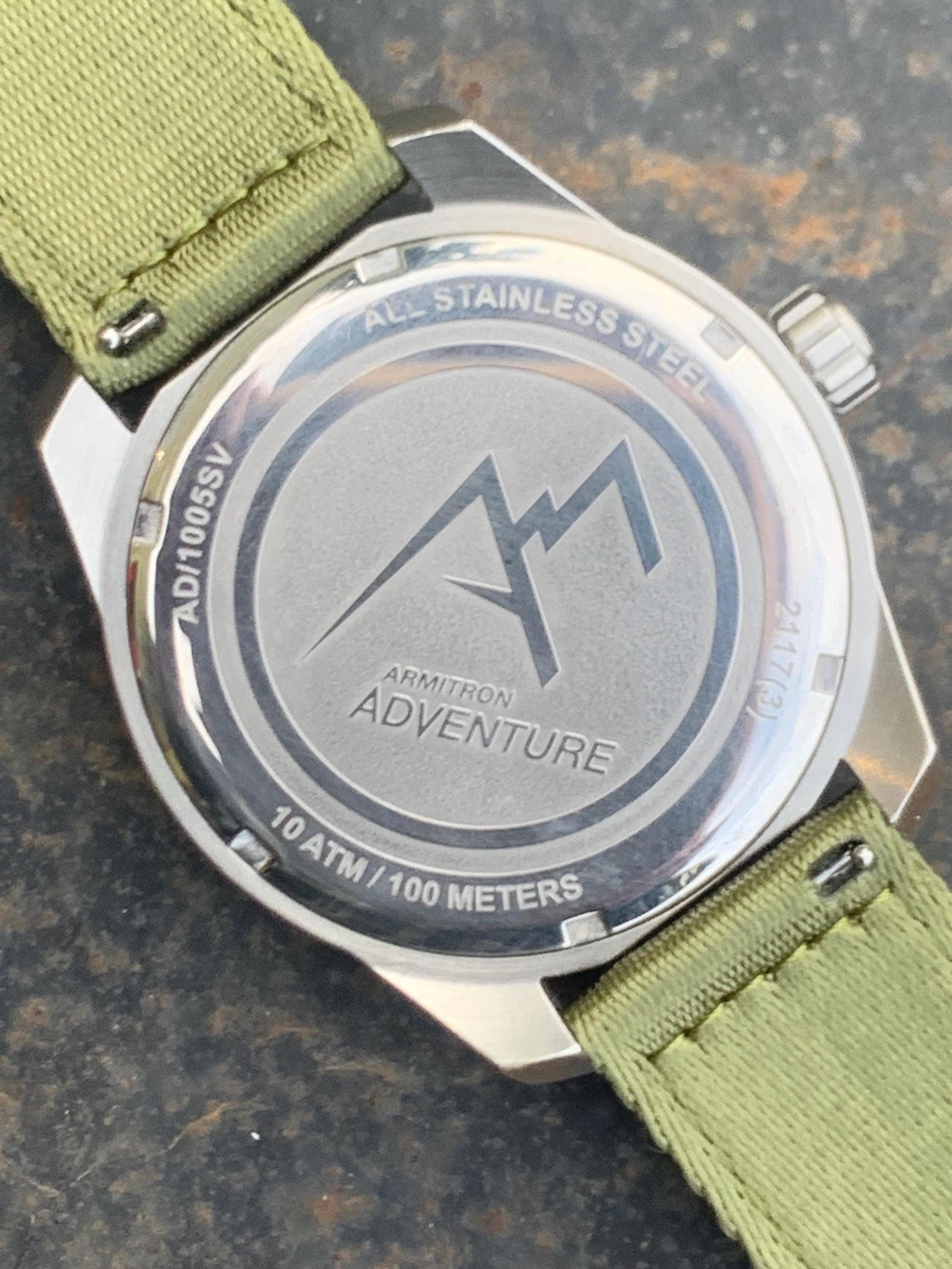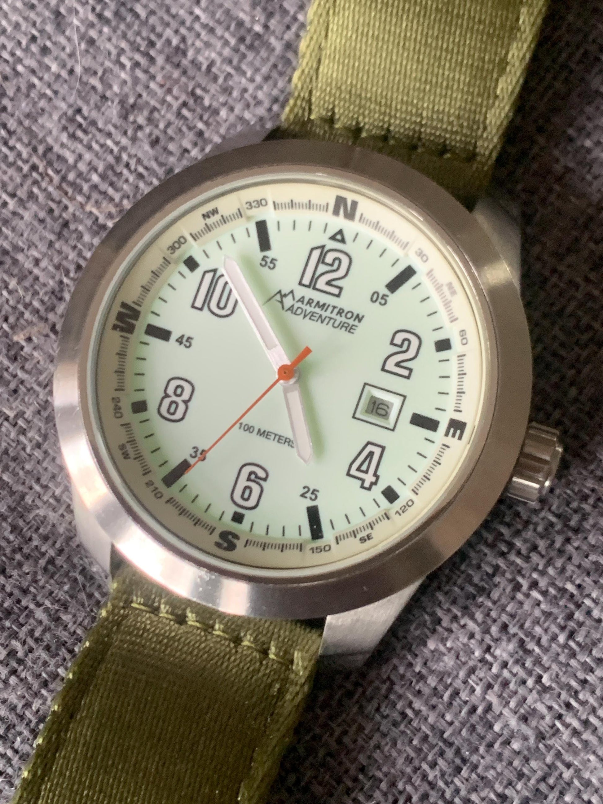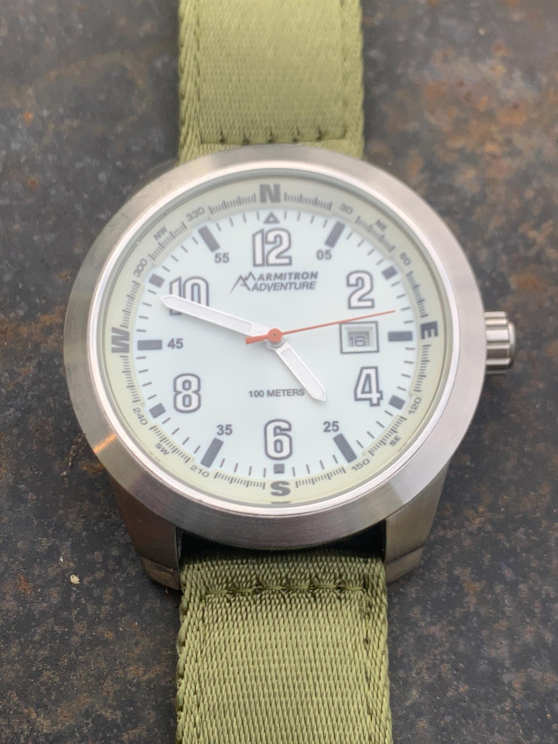 HUGE Armitron Adventure Watch - Brushed Metal, White Glowing Night Dial, 46mm! Date, Works Well, New Green Nylon Strap. New Batt. Outdoorsy