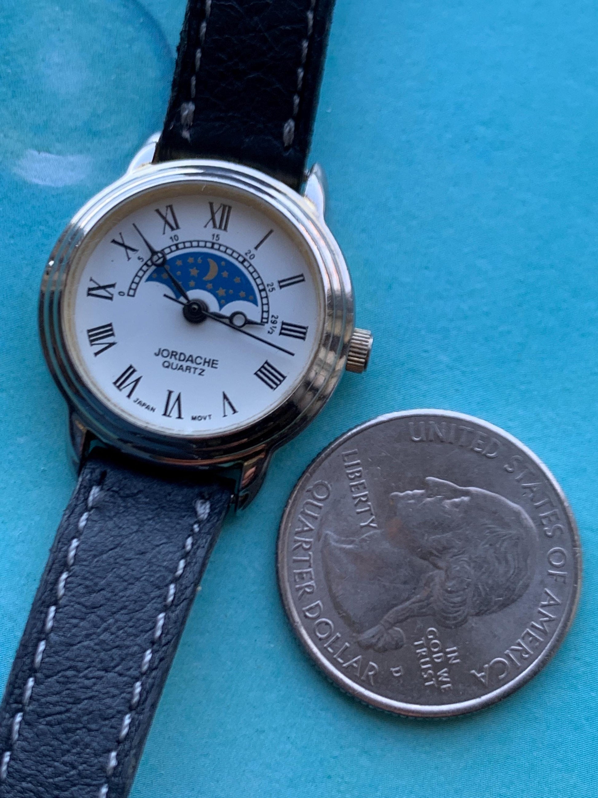 The watch is a Jordache. It is just under the size of a quarter, ergo: for women, generally speaking. The moon phase is pretend - the moon dial is just a graphic. There is a new battery. The strap is vintage leather. It works, but the moon phase is always the same.