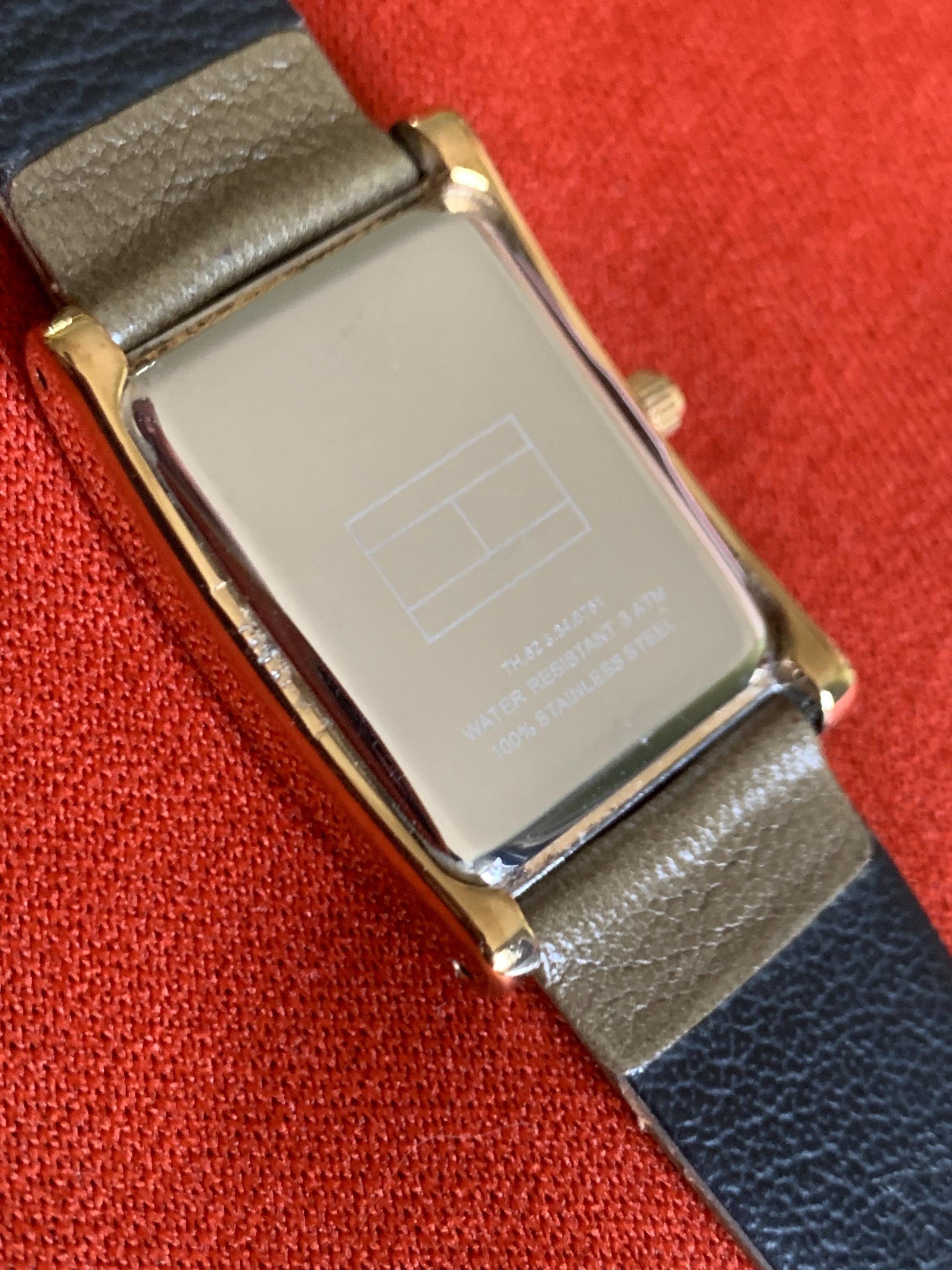 Gold and olive? It's a surprisingly stylish combo, especially on this late '90s Tommy Hilfiger tank watch. This watch is a perfect blend of classic and casual, with Roman numerals, a gold dial, and a cool dark olive leather band. Plus, it has a new battery, so you won't be late for any important '90s-themed parties.