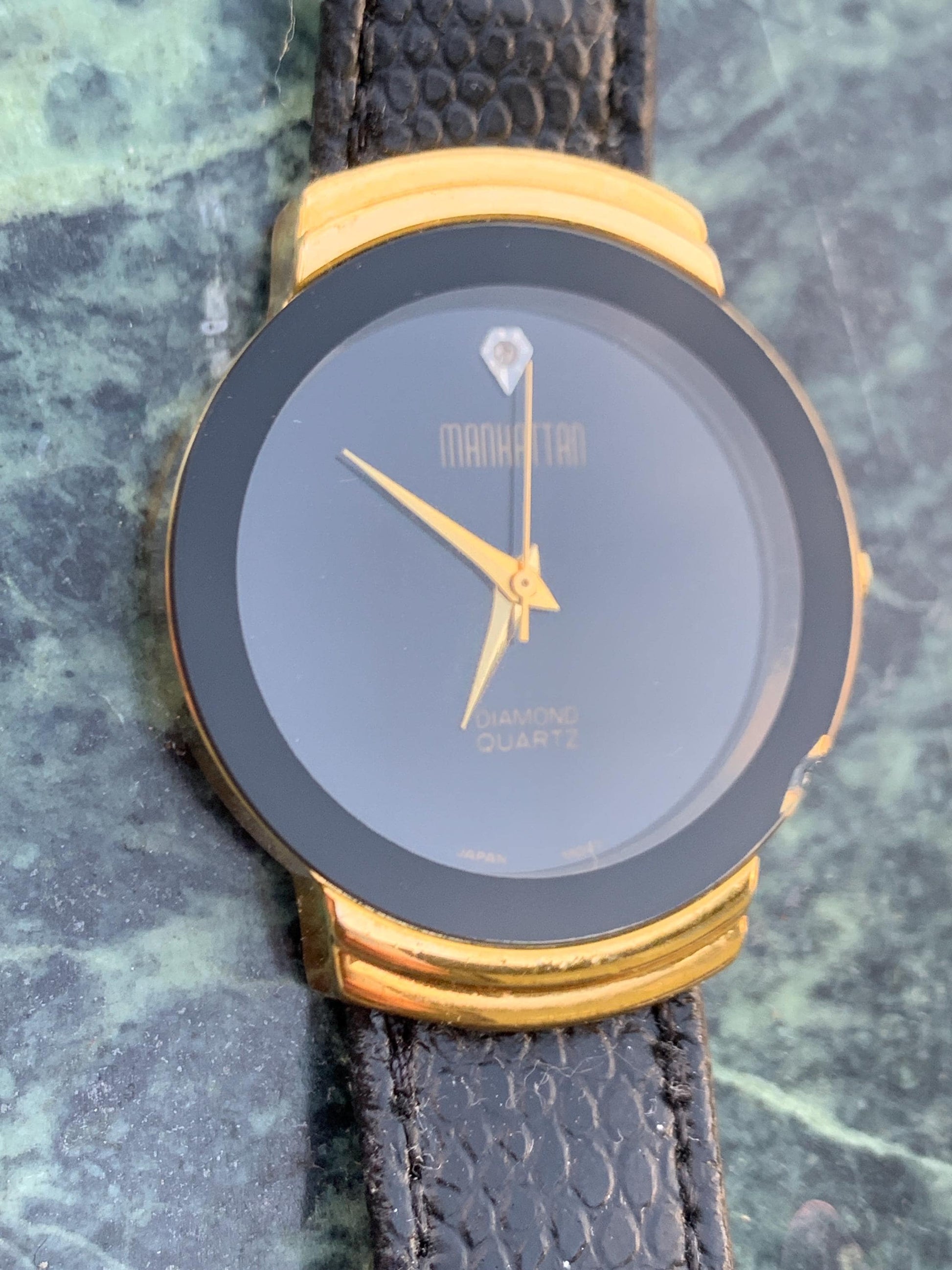 Manhattan 'Diamond' Quartz Museum watch. Fancy lugs, great gold tone. Black dial without indices. Keeps time well. 1990s. Small chip crystal