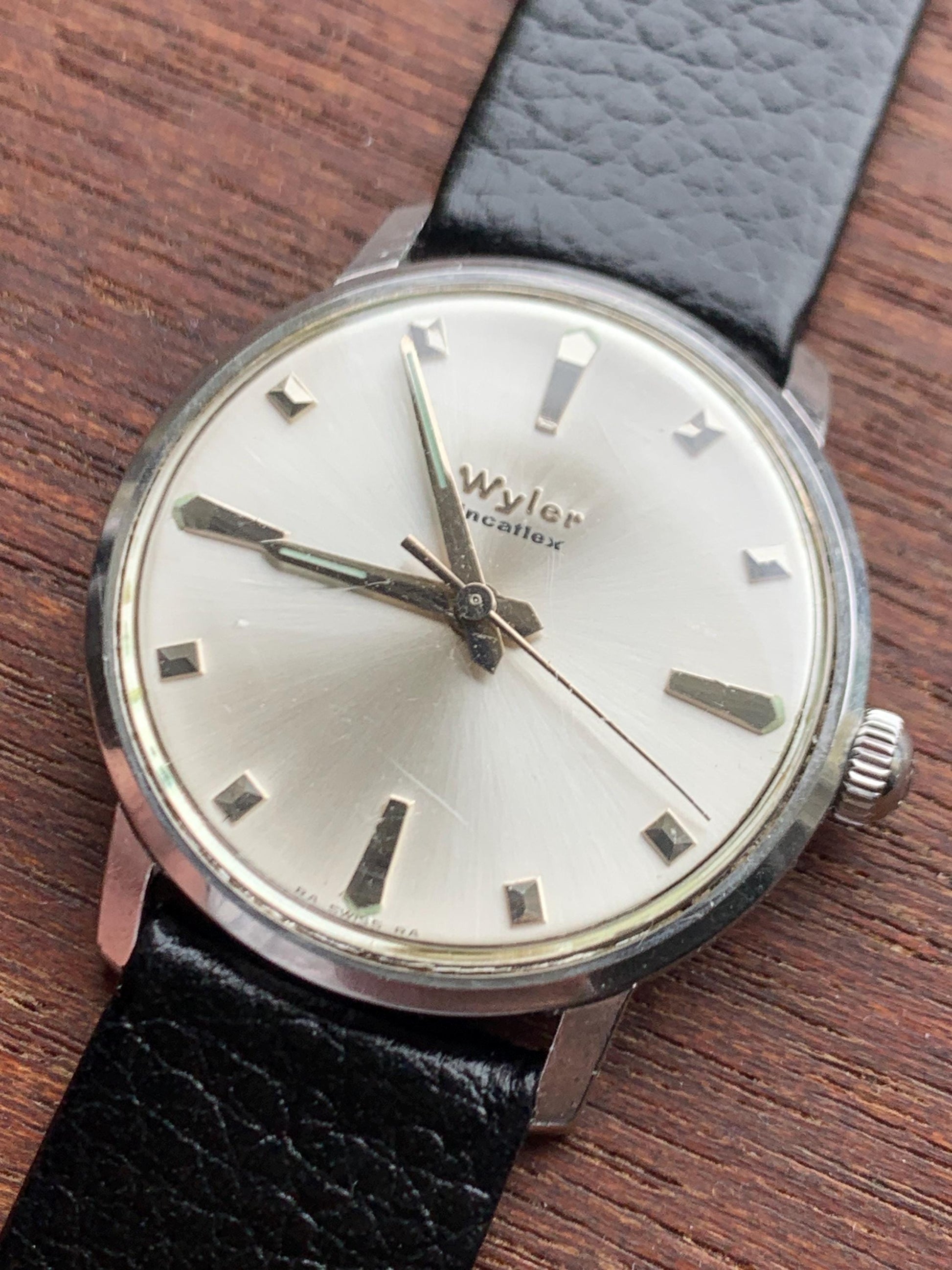 Iconic mid-60s Wyler Winder! Swiss-made with a radiant silver dial and Wyler's famous Incaflex. New black calf leather strap. MSM style, works great!