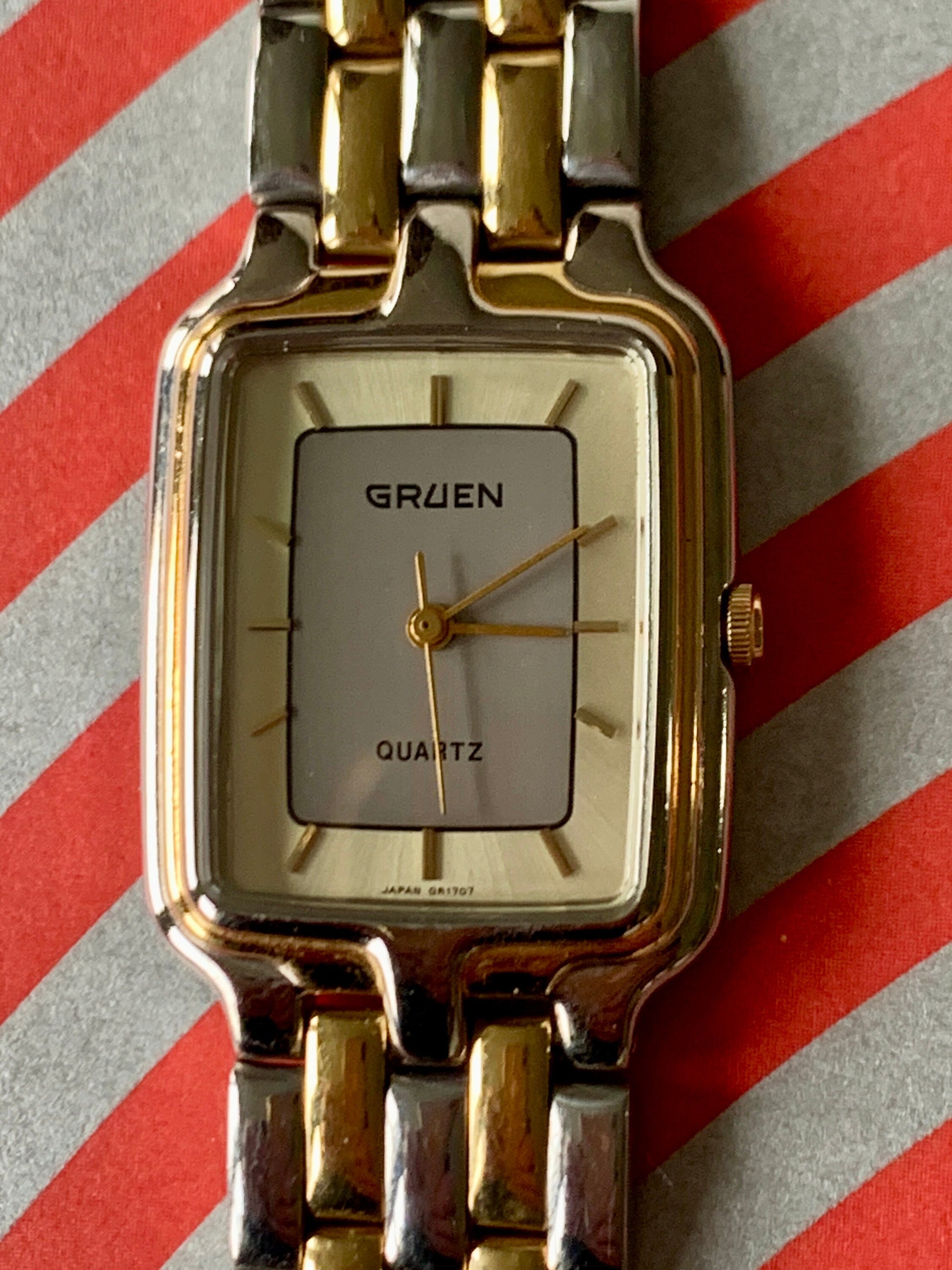 Neo-Vintage: 1980s Gruen Two Tone Metal Tank Watch - Barely worn, new battery, keeps time well. Retro flair! 001-6L32