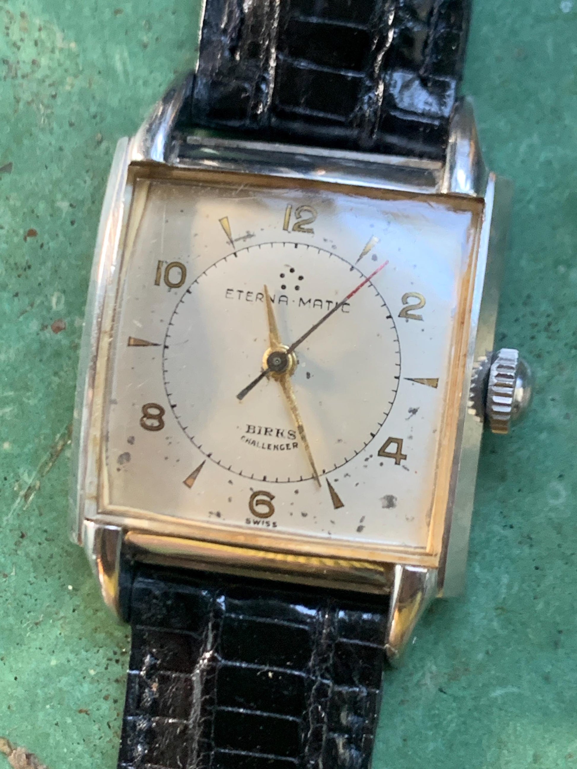 This is a stunning Eternamatic tank watch from the 1940s. Signed "Birks Challenger" by the famous Canadian Jeweler. Birks was considered the Canadian TIffany. Watches with the Birks Challenger imprint were particularly renowned in the mid-century.