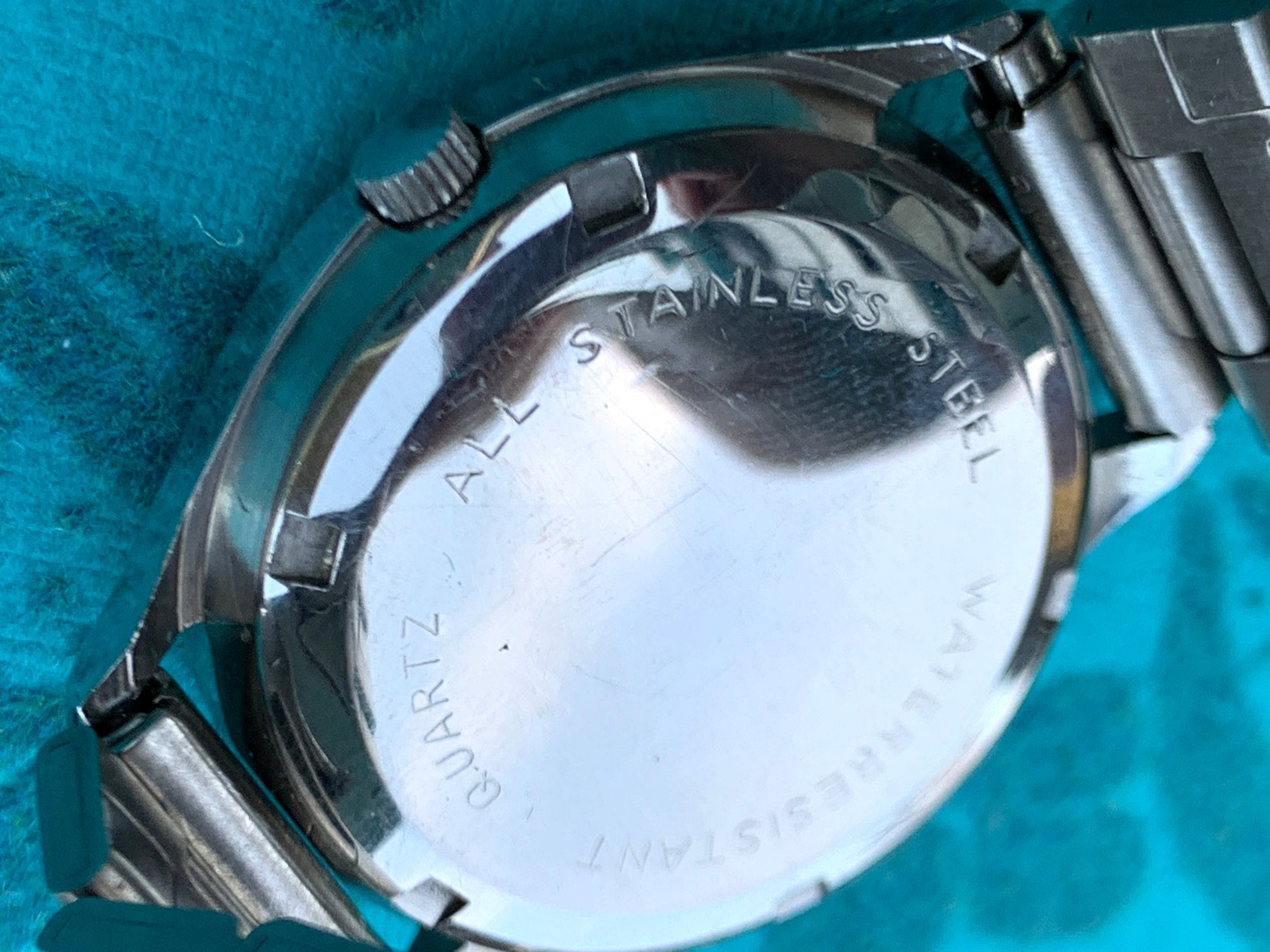 This watch probably dates from around 1979/1980 and has been well stored among Bob's Watch Collection since 2001. A fresh battery and a few weeks observation show it working steadily and keeping excellent time. Date and time set easily and are aligned perfectly. So old, but so new. Crystal is perfect, metal has very minimal light scratches -- see photos.