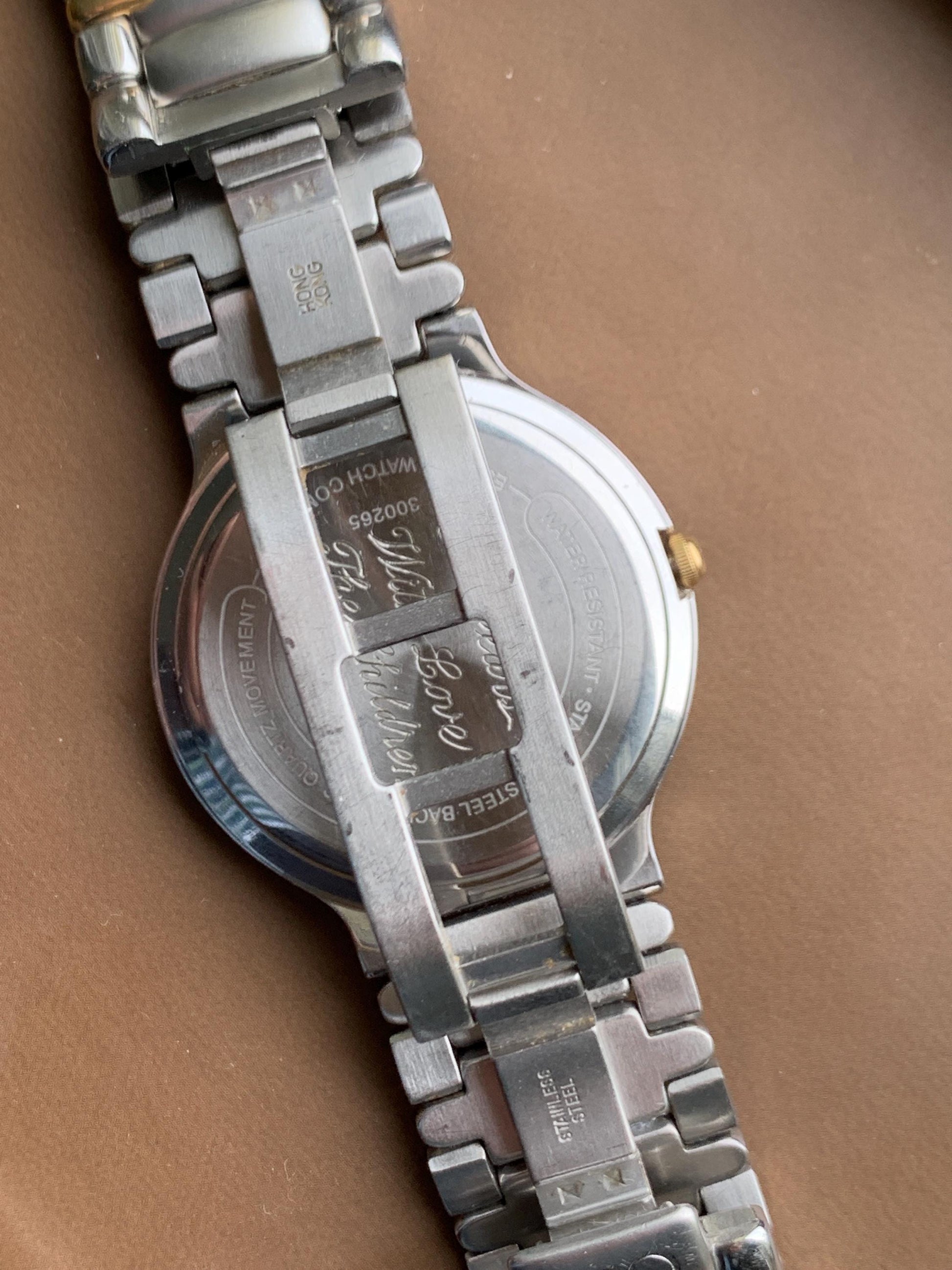 Overall good condition -- watch dates from around the 1990s. Fresh battery installed. Crystal has been replaced. Bezel, case, and case back are all in good condition with a few light scratches and a couple little dings. Elegant two-tone butterfly-clasp ESQ band is very good -- some very fine scratches consistent with its age. Caseback is inscribed, "Fifty Years With Love The Children"